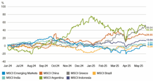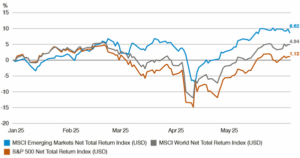 Los mercados emergentes han tenido un buen comportamiento este año, superando a los mercados mundiales. El índice MSCI Emerging Markets (USD) ha obtenido una rentabilidad del 8,62 % en lo que va de año, superando tanto al índice MSCI World, con un 4,94 %, como al S&P 500, con un 1,12 % (todos en USD, a 30 de mayo de 2025). Este rendimiento superior pone de relieve la importancia de la selección y la gestión activa a la hora de aprovechar las oportunidades adecuadas.