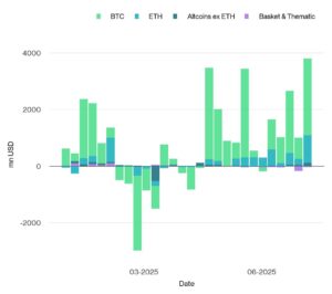 El informe semanal de Bitwise de la semana 29 de 2025 destaca el reciente rendimiento alcista de Bitcoin, que alcanzó por primera vez los 120.000 dólares, marcando un nuevo máximo histórico. Este repunte en el precio del bitcoin fue impulsado por una fuerte demanda de los criptoactivos a través de ETP, con entradas netas globales que casi alcanzaron los 4.000 millones de dólares, las mayores de 2025. Este flujo positivo refleja la confianza creciente de los inversores y una propensión al riesgo elevada en los mercados.