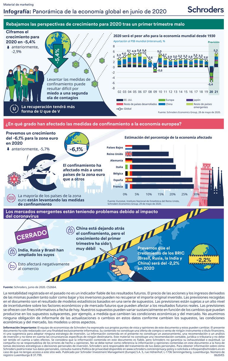 Mercados emergentes: el mayor cambio en nuestras previsiones para los mercados emergentes es para China; revisamos nuestra previsión de crecimiento para China al 2,2% para este año, desde el 5% que preveíamos anteriormente. También hemos rebajado las perspectivas al resto de economías BRIC (Brasil, Rusia, India, China). ahora prevemos que experimenten una contracción del -2,2%, frente al crecimiento del 1,8% que pronosticábamos anteriormente. Esto se debe en parte a que han tenido que imponer cierres más duraderos de lo que barajábamos previamente y porque, a nivel mundial estamos asumiendo que la recuperación se prolongará en el tiempo, lo que tendrá consecuencias para el comercio.